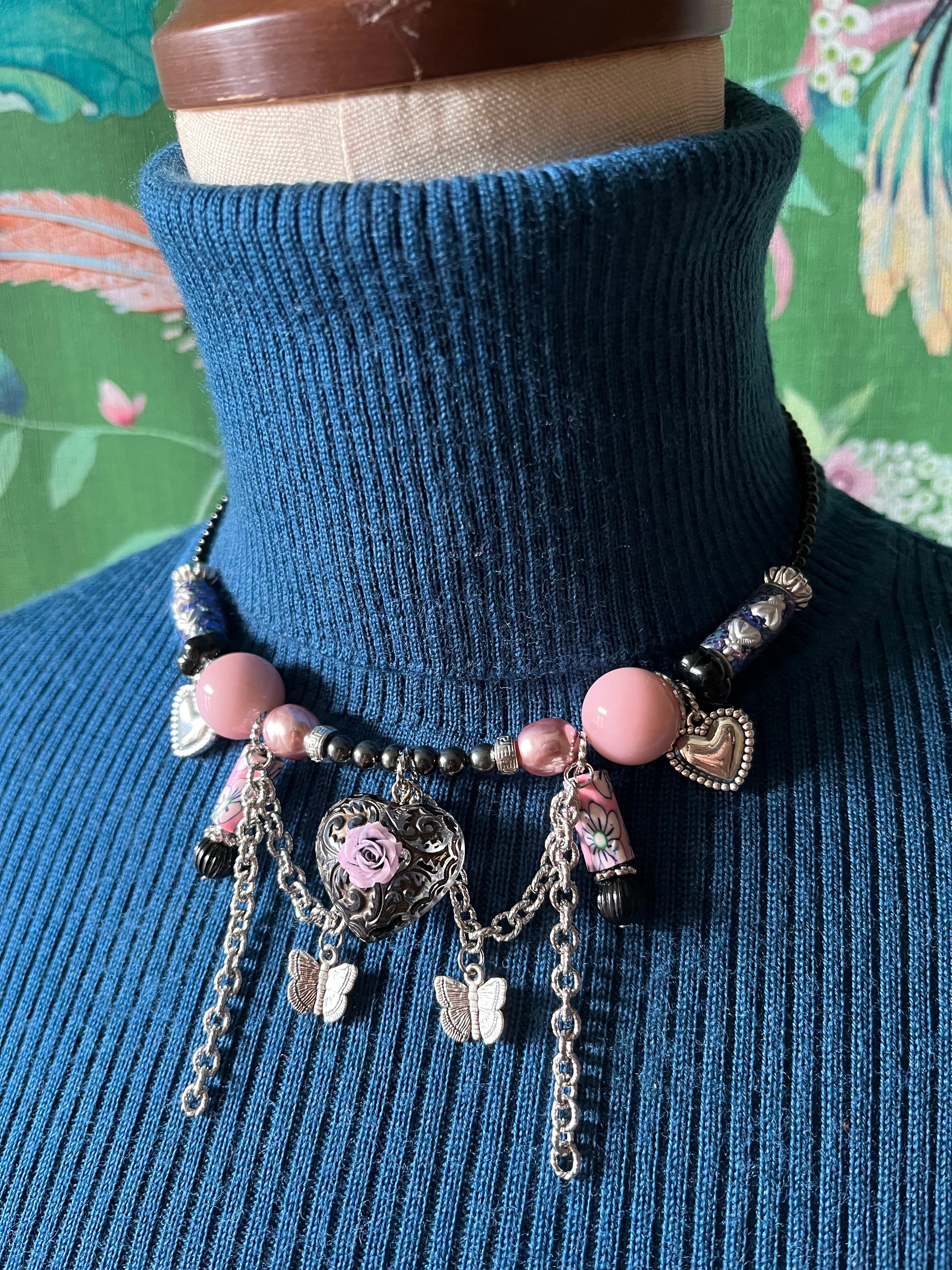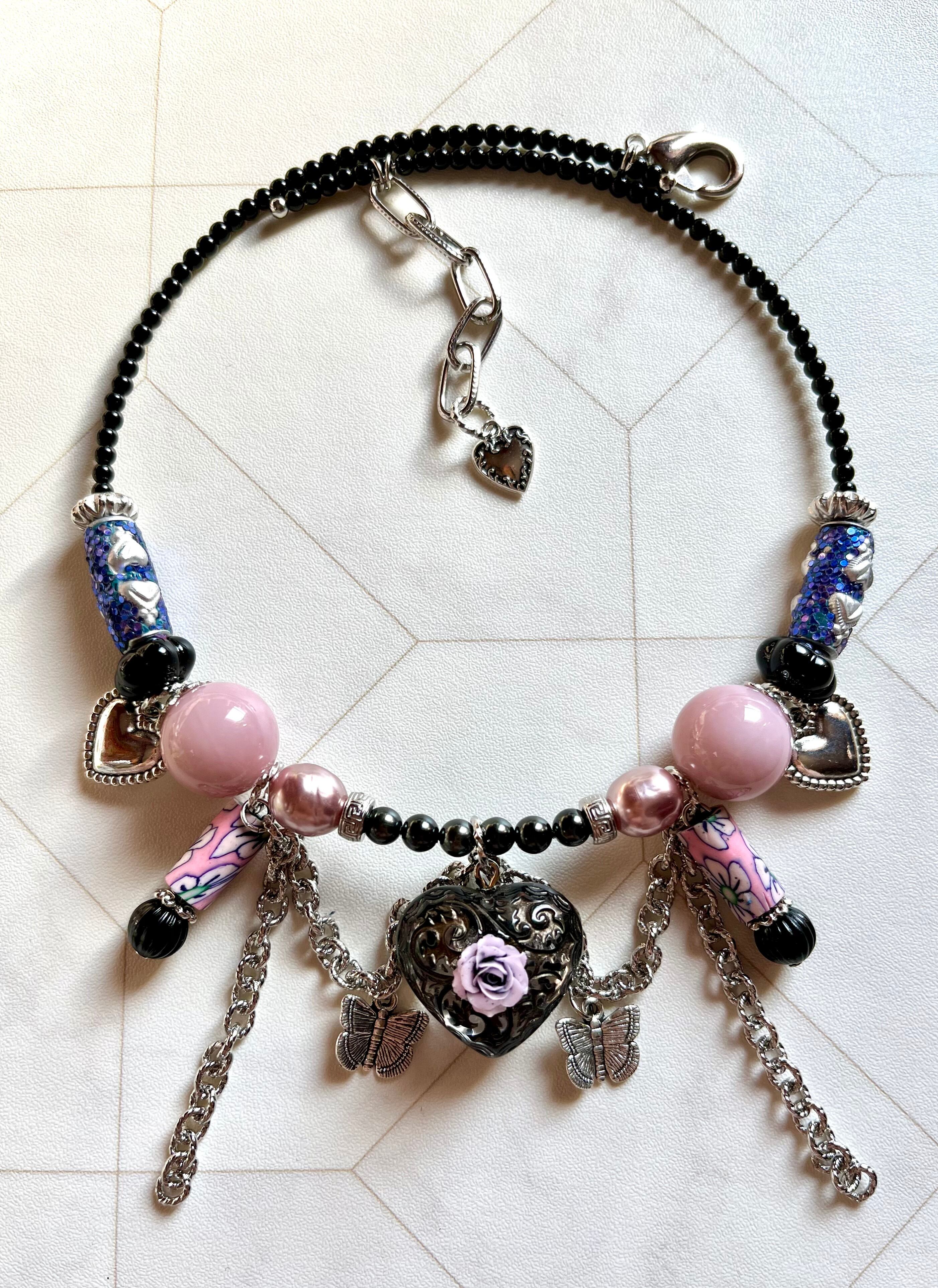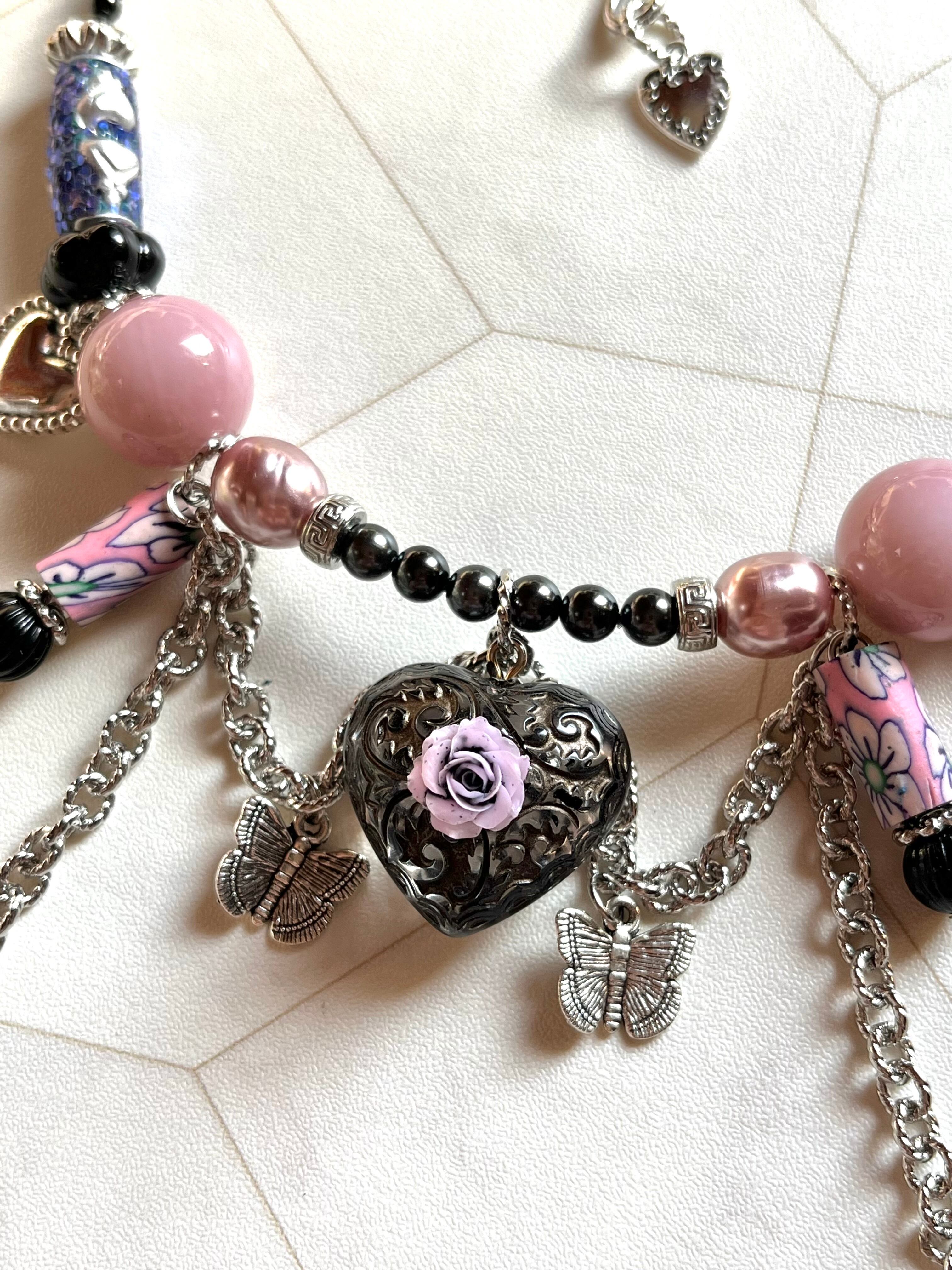 素材:チェコ硝子ビーズ、キャストパーツ、クレイビーズ、日本製染めアクリルビーズなど