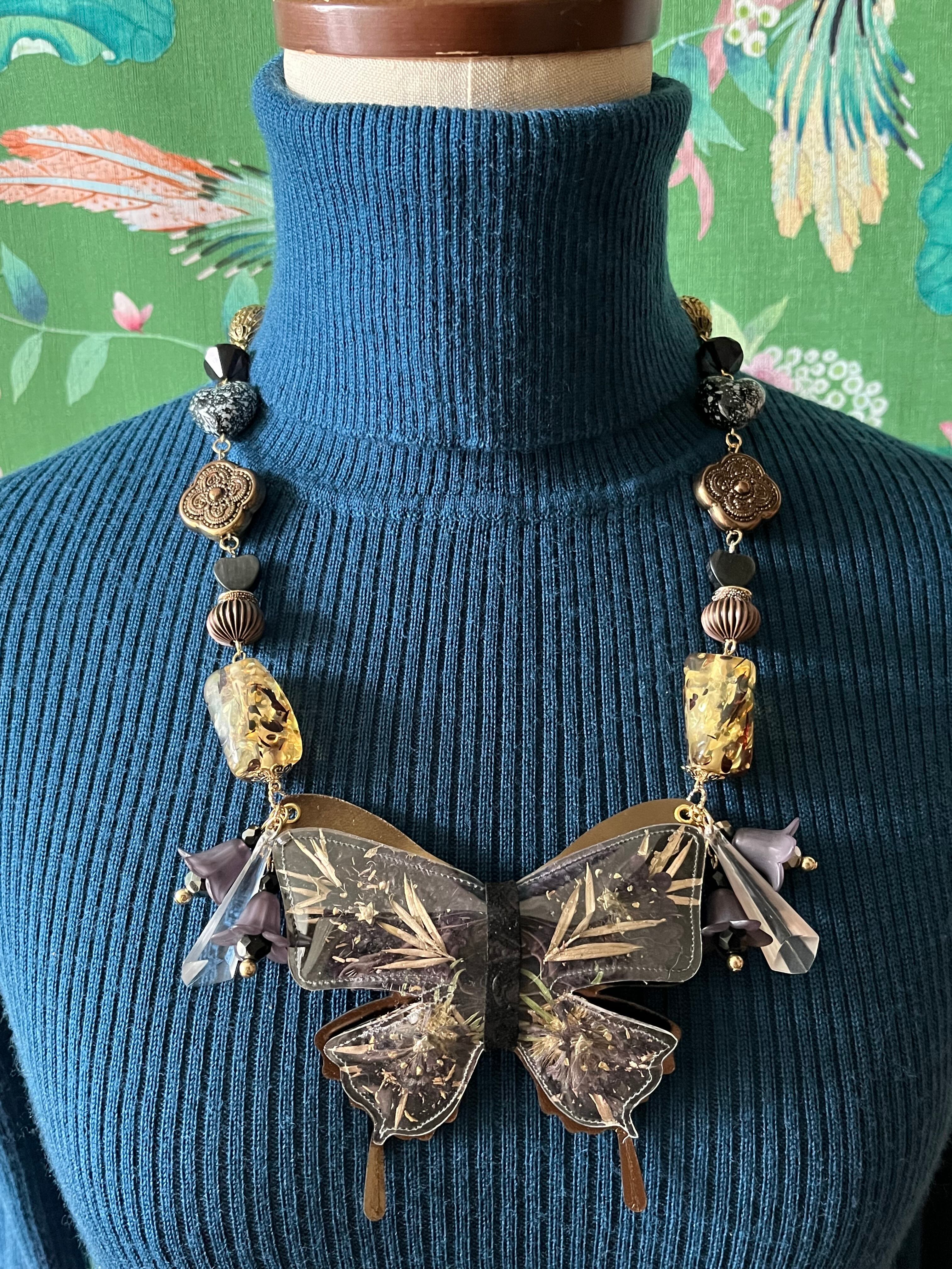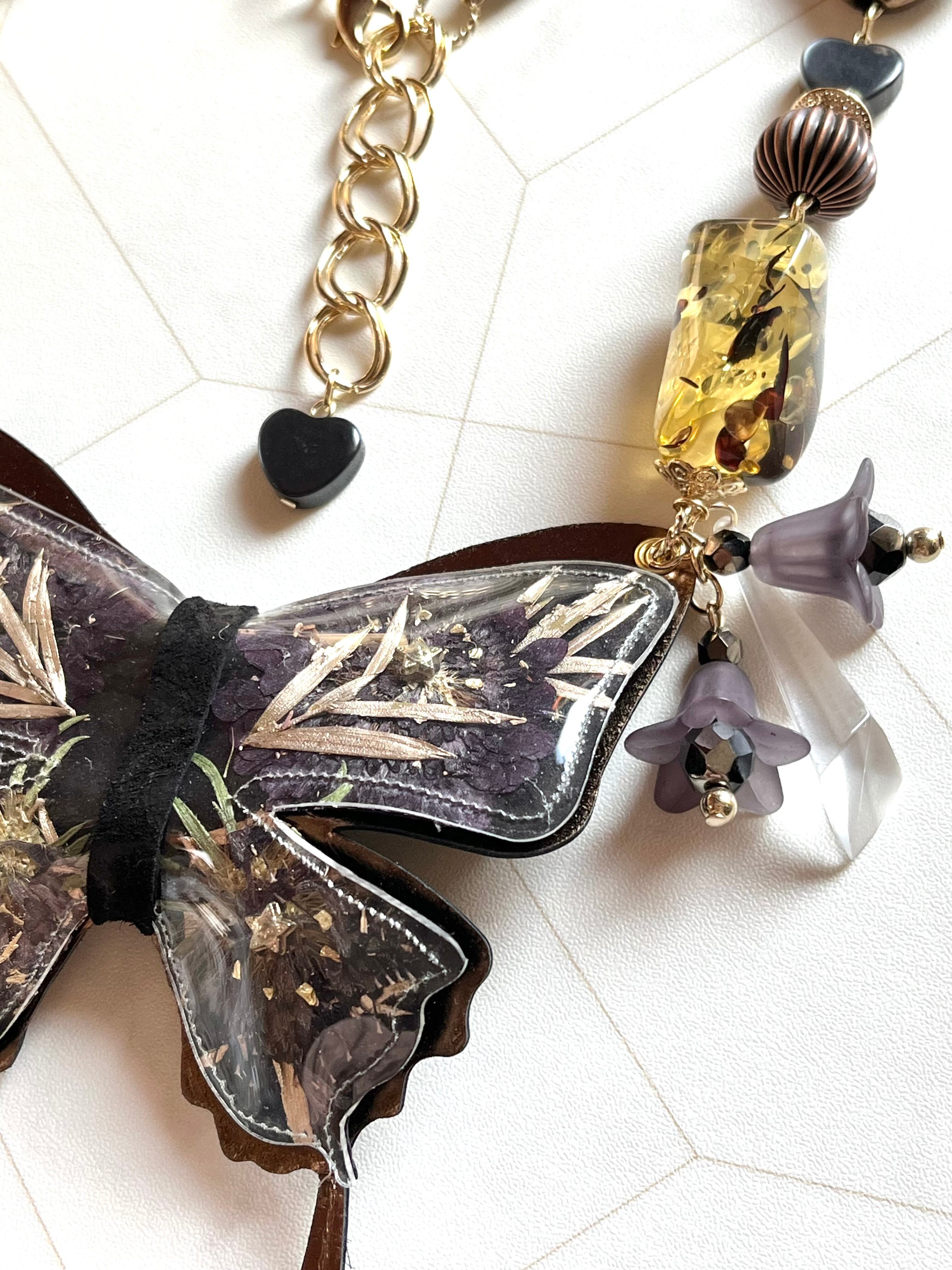 ONISさんの本革と黒スカビオサの押花を使用した蝶々モチーフをAPOLIAがデコラティブなネックレスに仕上げました。