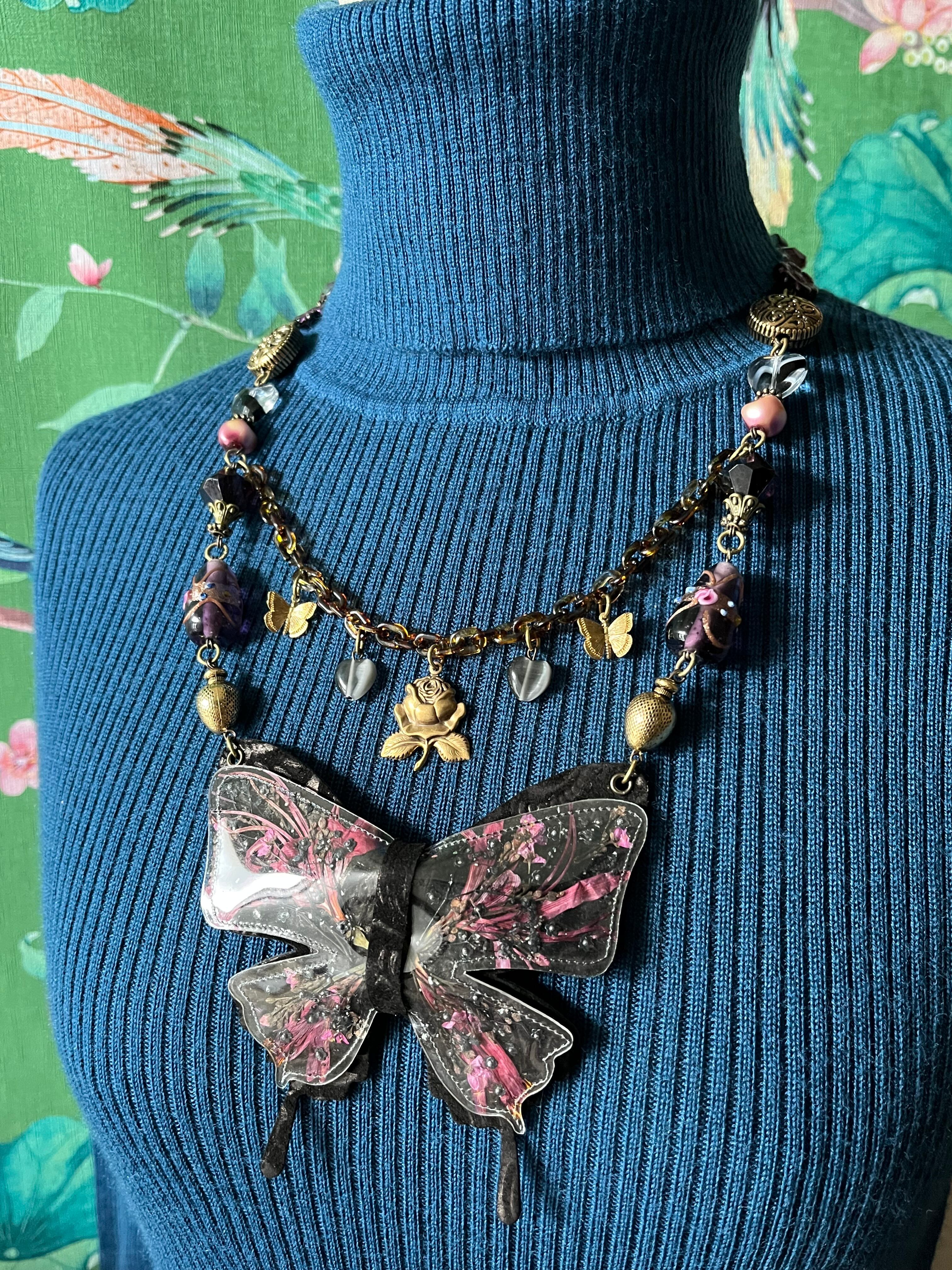 ONISさんの本革と彼岸花の押花を使用した蝶々モチーフをAPOLIAがデコラティブなネックレスに仕上げました。