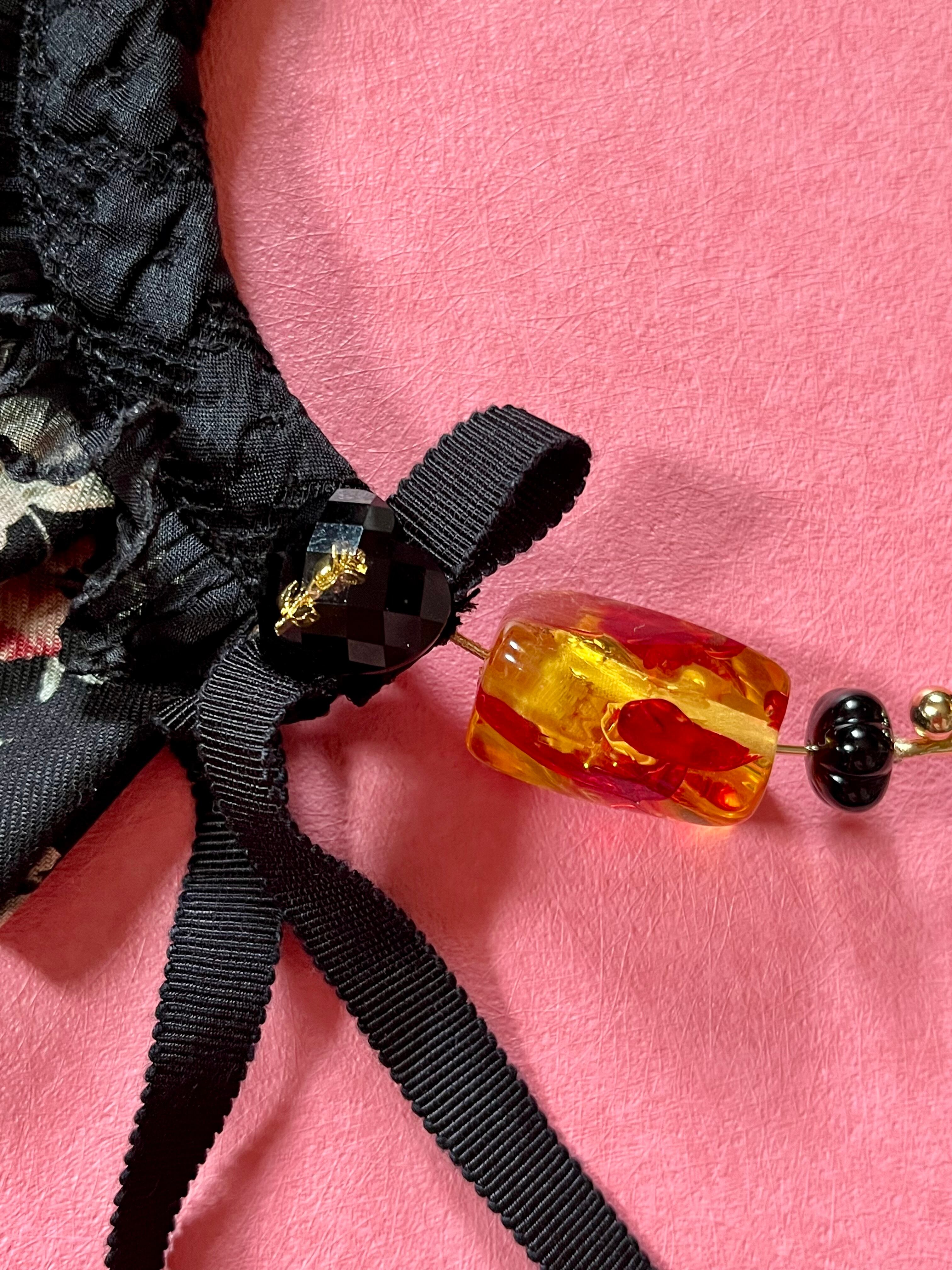 素材:綿プリント生地、グログランりぼん、プリーツレース、カボションなど
