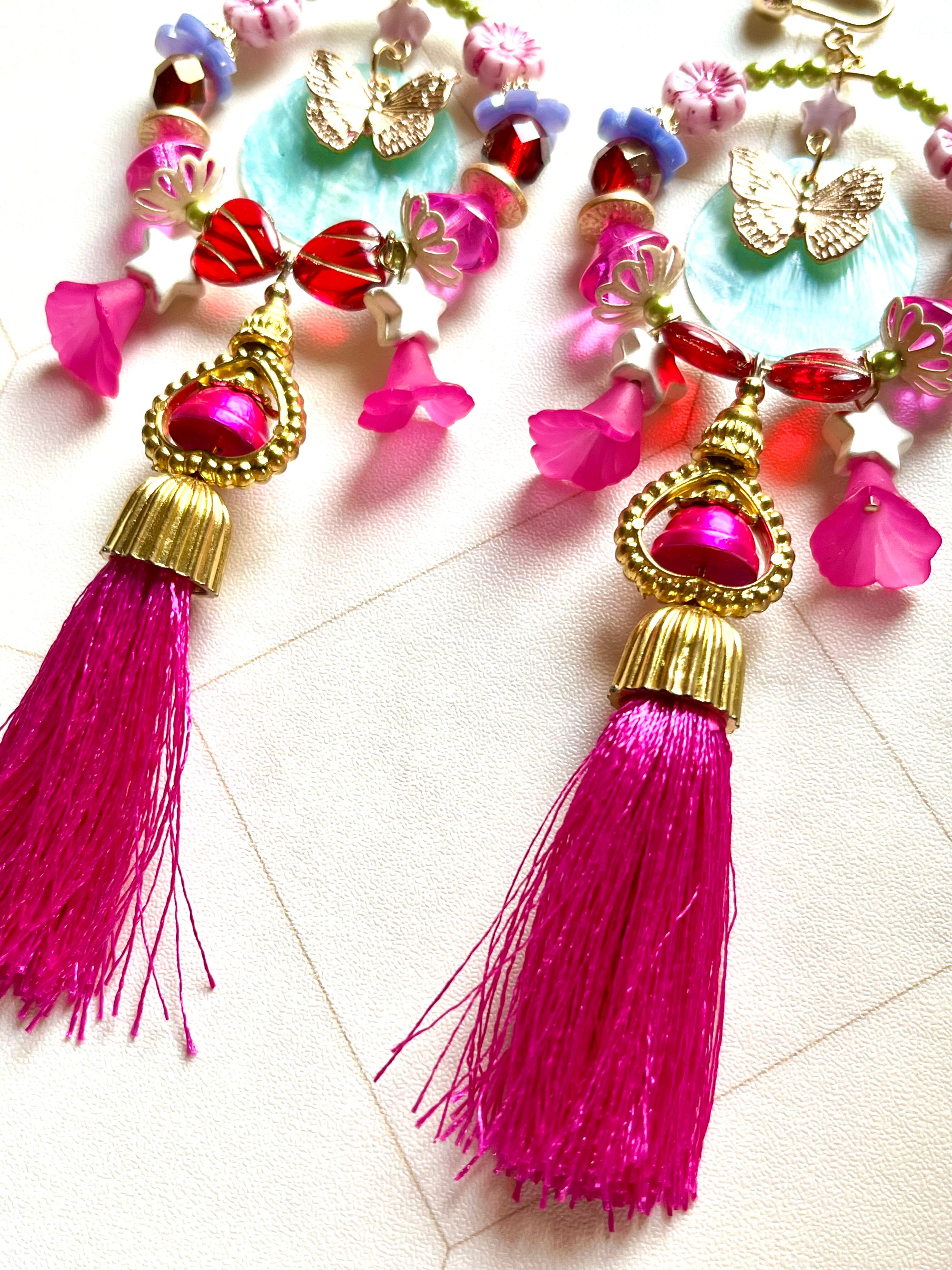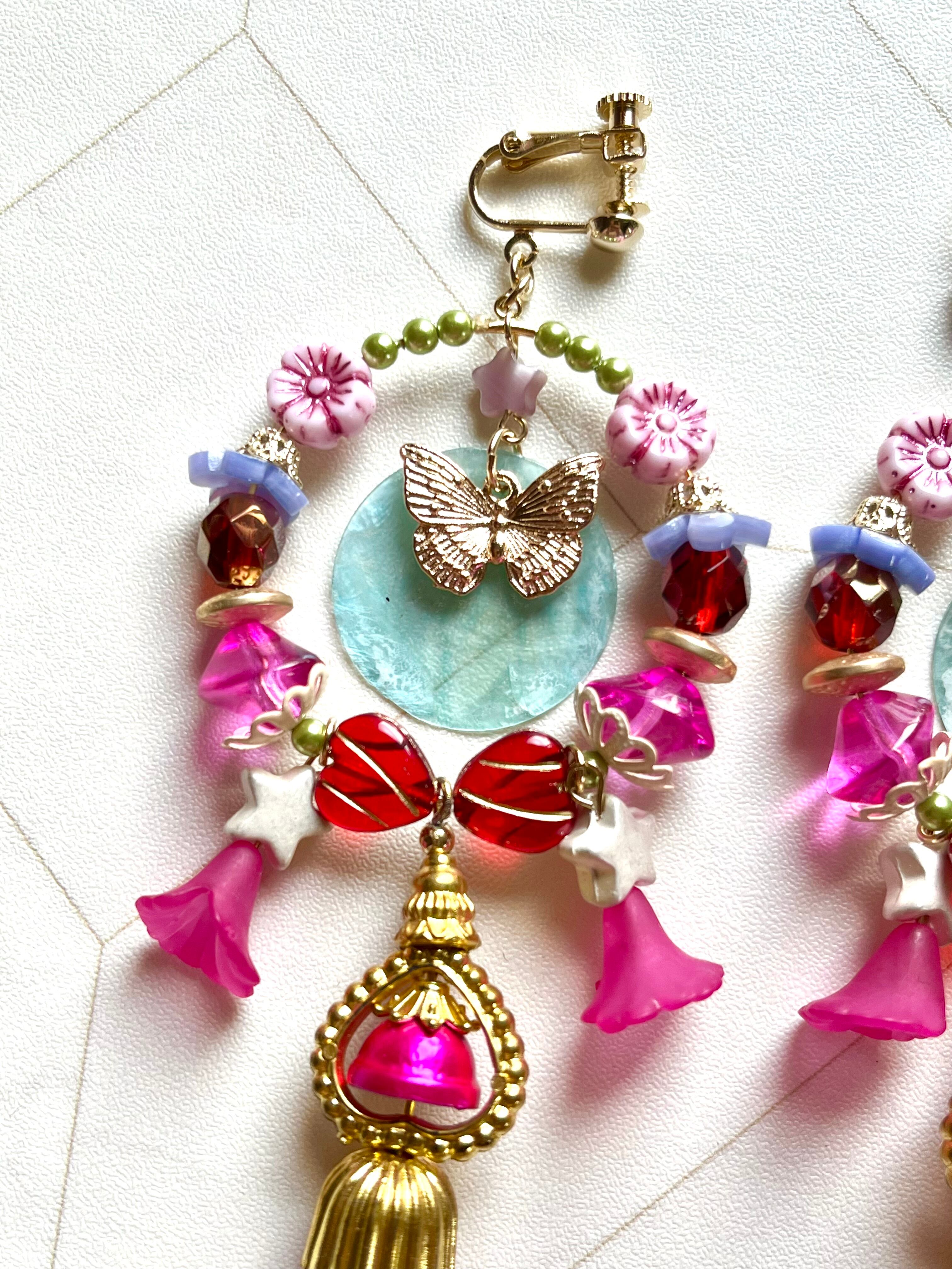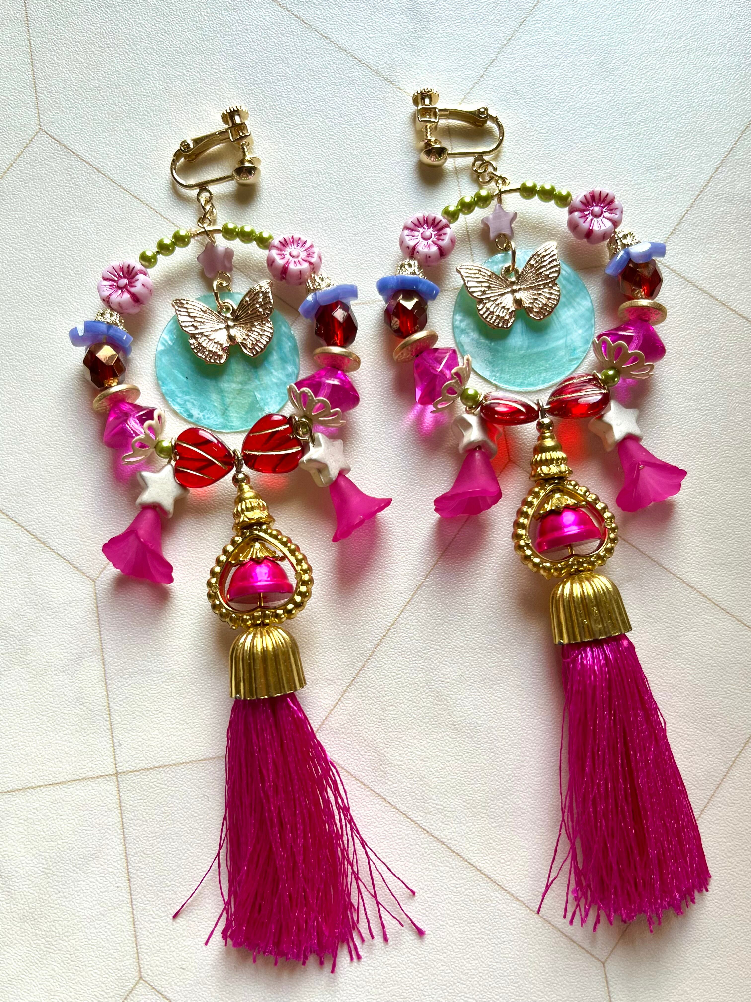 素材:チェコ硝子ビーズ、キャストパーツ、インド製タッセル、貝ビーズなど