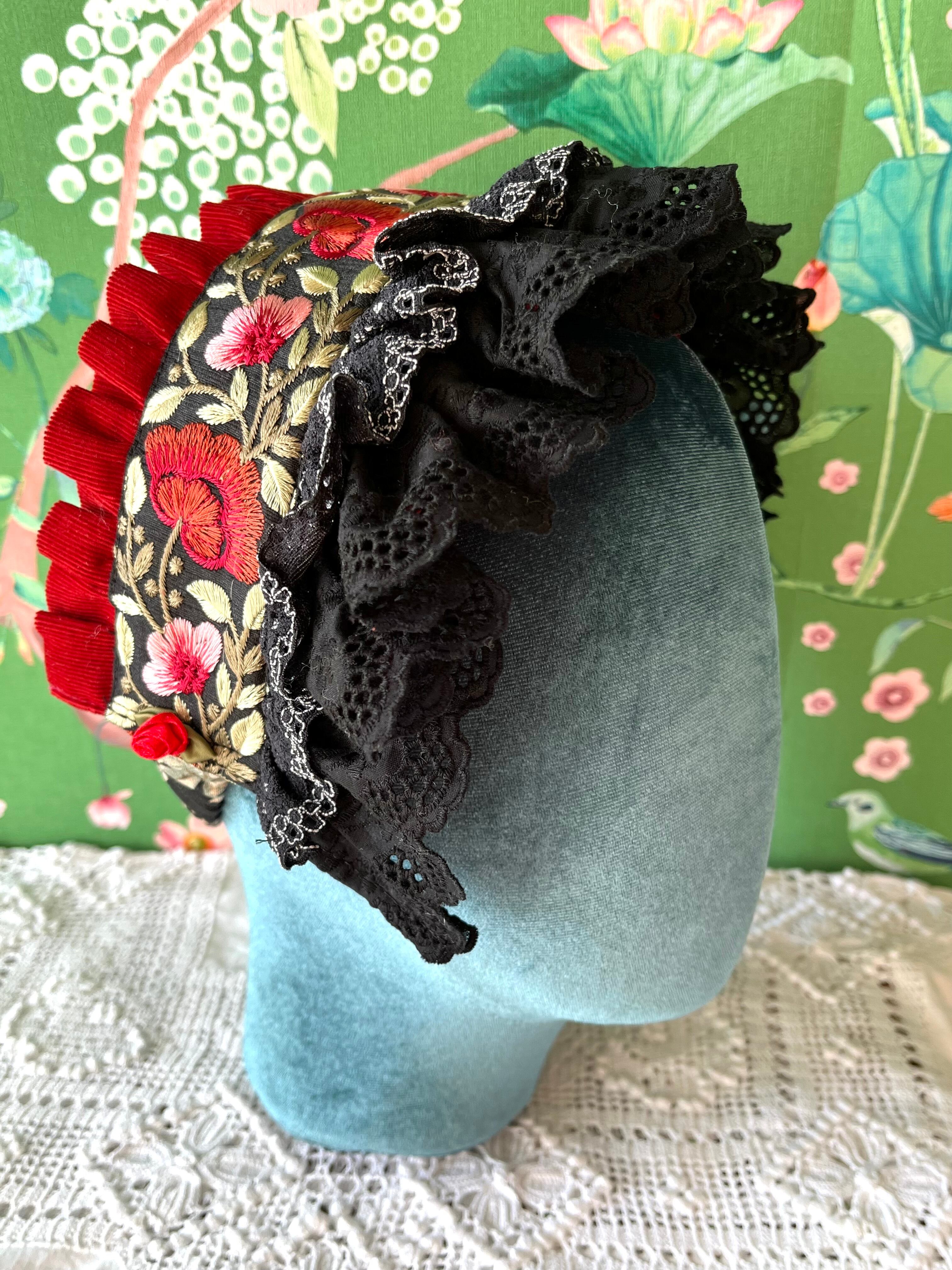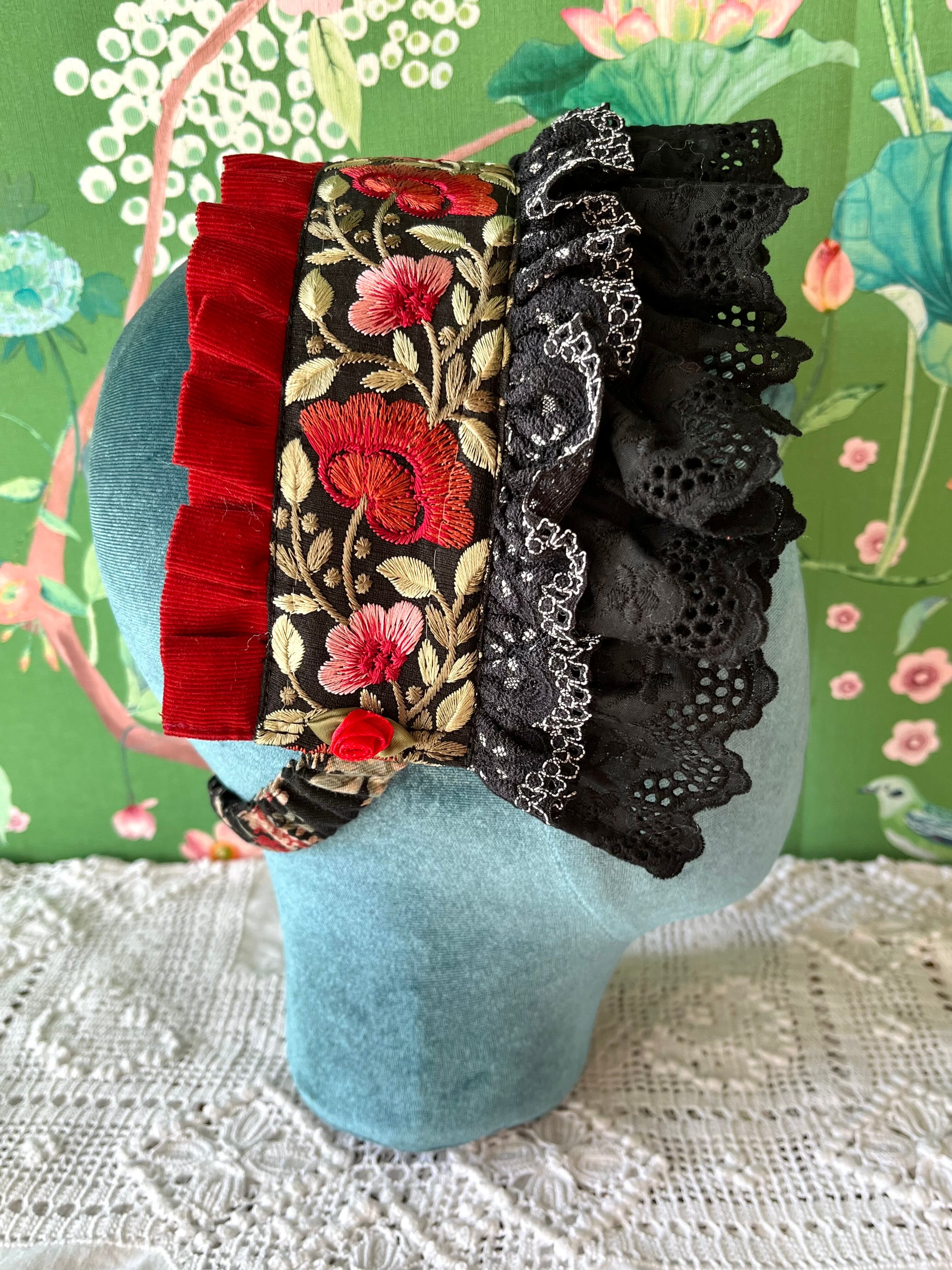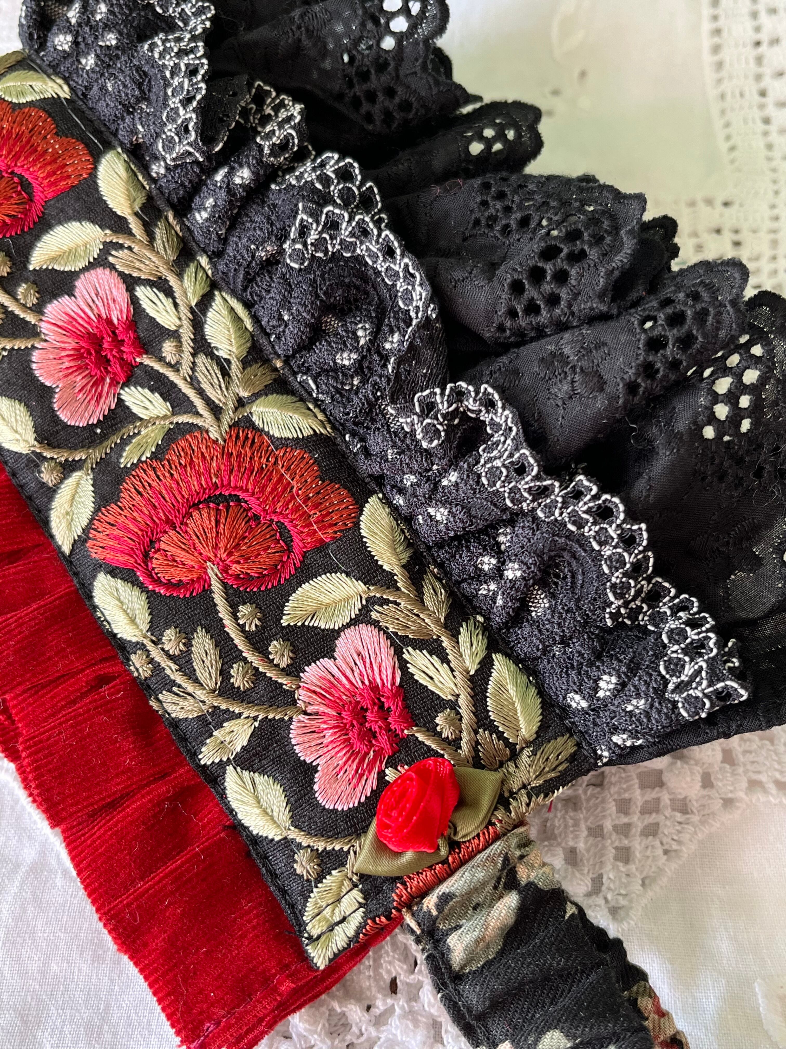 素材:インド刺繍リボン、綿レース、コーデュロイ生地、台湾製巻バラなど