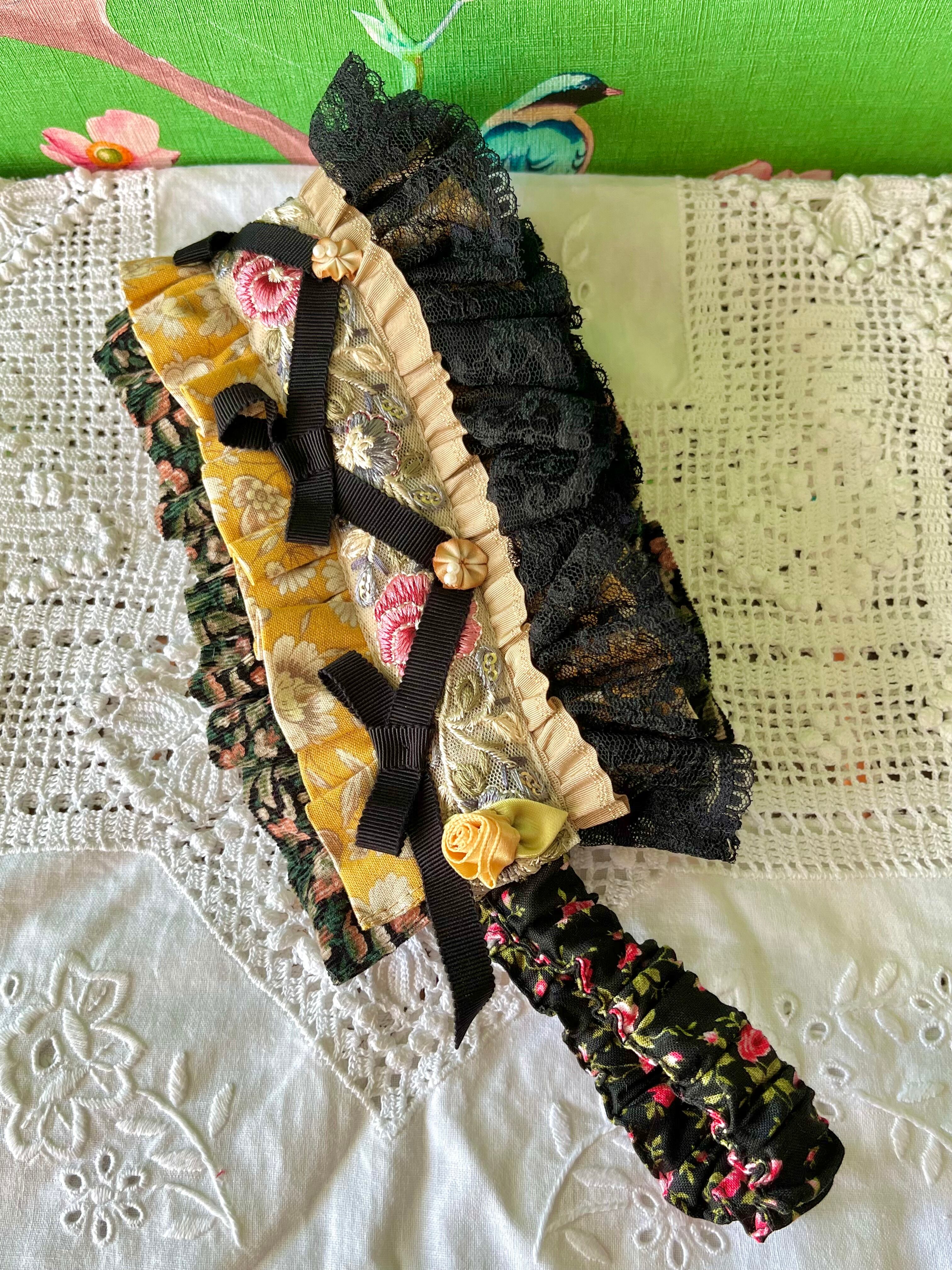 素材:インド刺繍リボン、チュールレース、コーデュロイ生地、台湾製巻バラなど
