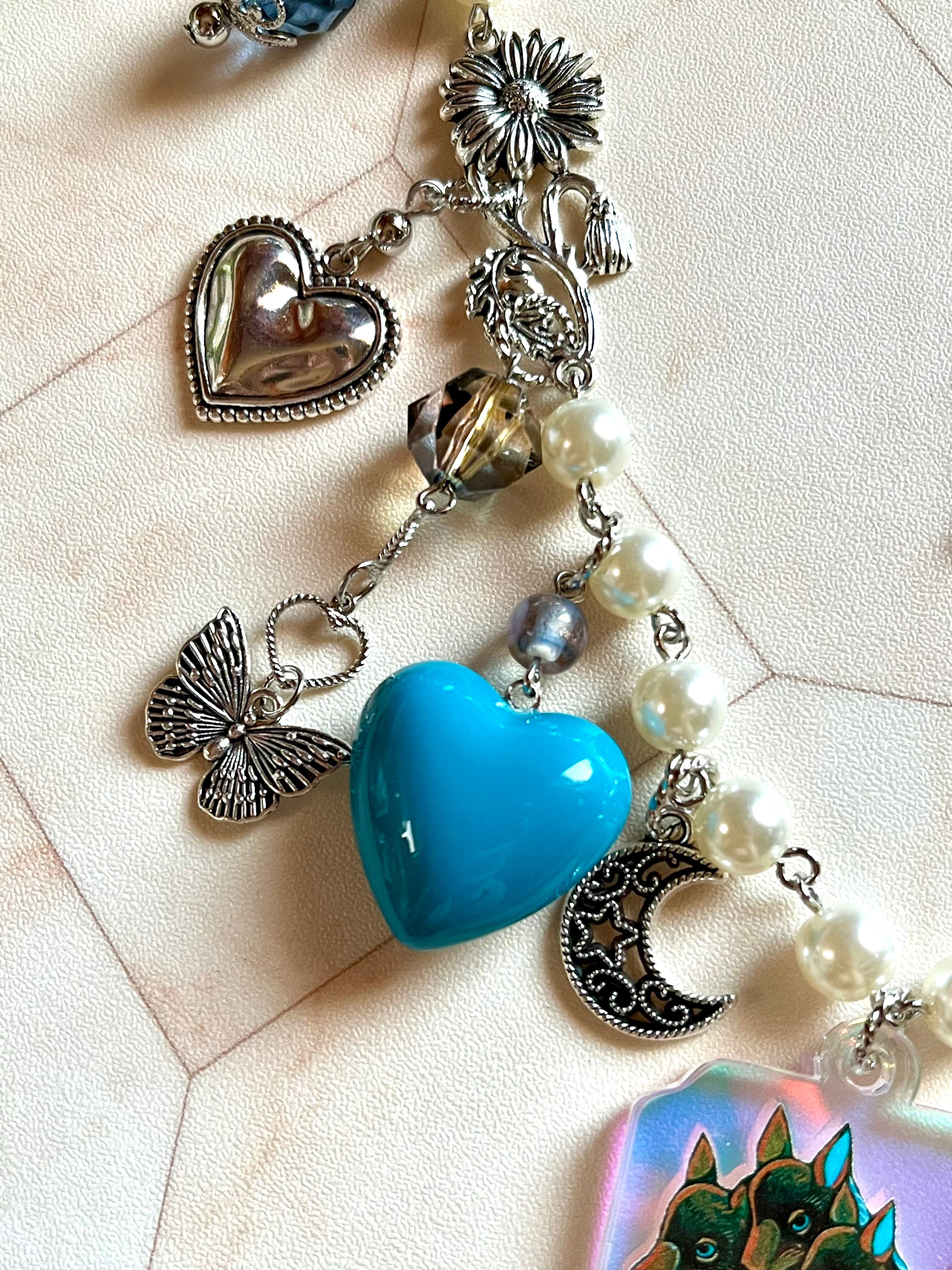 素材:チェコ硝子ビーズ、キャストパーツ、アクリルチャーム、プラスチックビーズなど