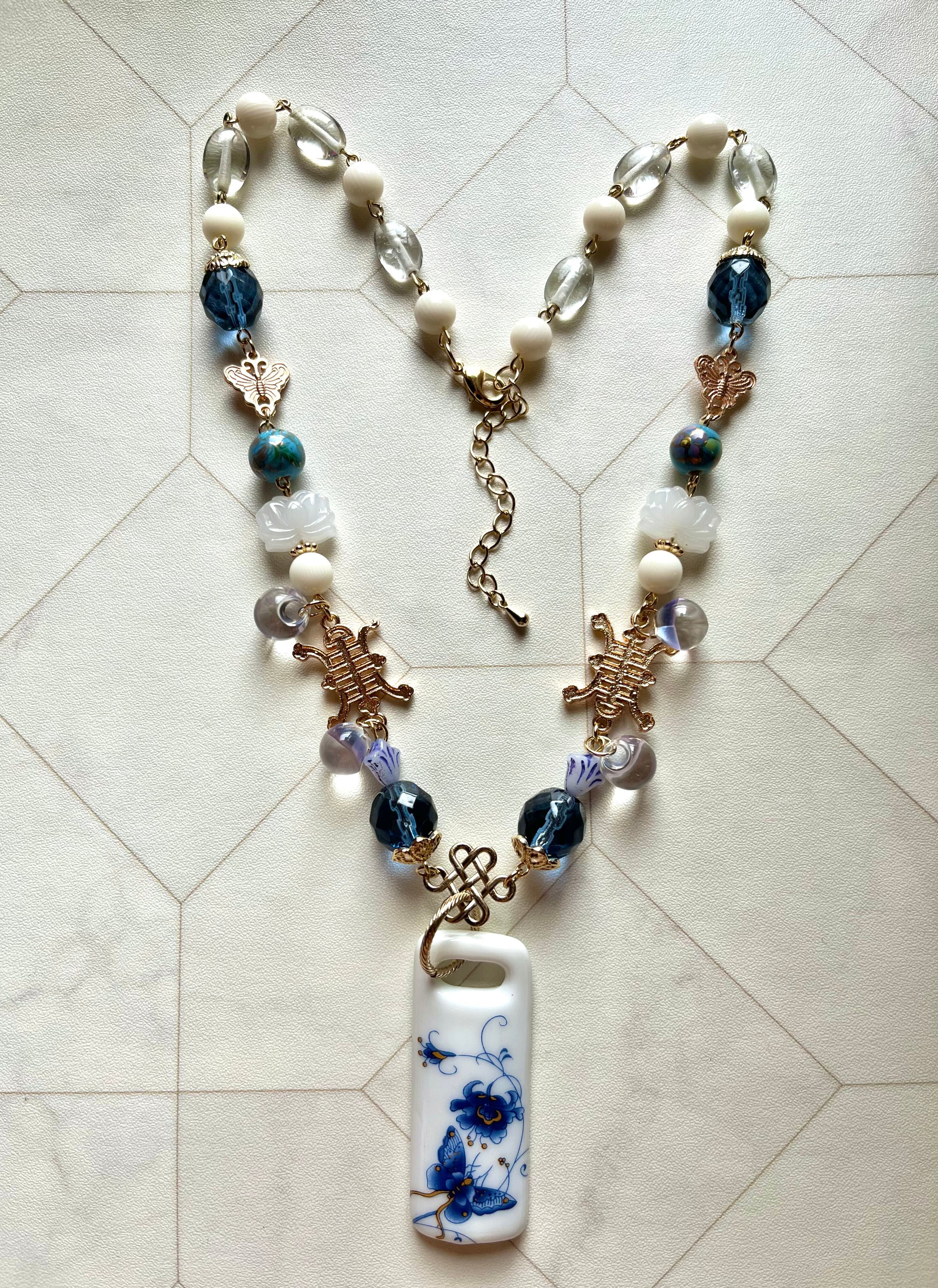 実際の陶器素材のペンダントトップを使用したデザイン、美しく装飾的なネックレスです。